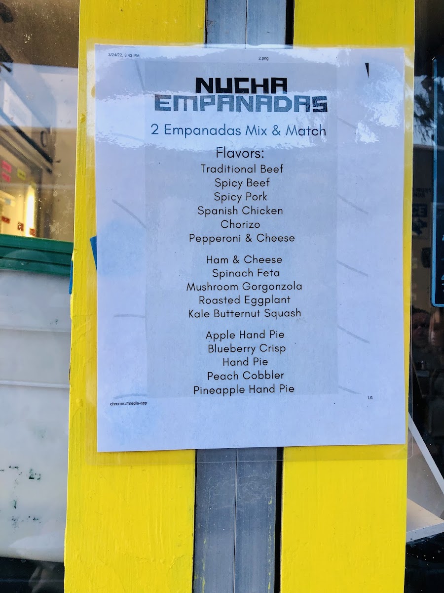 The menu at Nucha Empanadas offers a delightful variety of savory and sweet options that cater to diverse tastes. For those craving classic flavors, the Traditional Beef Empanada and Spanish Chicken Empanada are sure to satisfy, while the Spicy Beef Empanada adds a bit of heat for spice enthusiasts. For vegan diners, the Mushroom Empanada provides a flavorful, plant-based option. On the sweeter side, the Apple Pie Empanada and Pecan Pie Empanada offer a comforting, dessert-like finish to any meal. The array of empanadas, each bursting with unique ingredients, makes Nucha a great spot for anyone looking to enjoy a quick yet delicious bite in San Francisco.